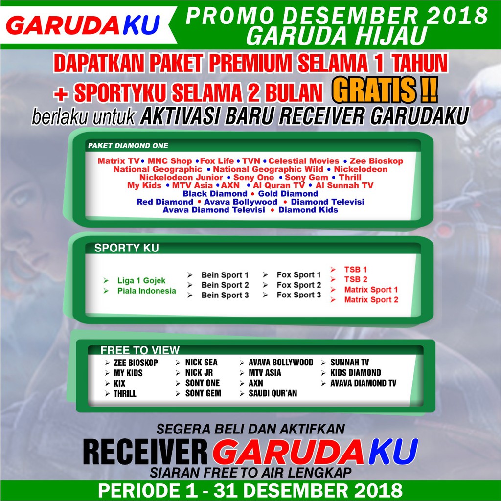 Berdasarkan kebijakan dari nex parabola, paket ftv yang ada dari kepengurusan sebelumnya masih . Decoder matrix garuda dapat menerima siaran bein sports 1 ( ch 15), bein . Setelah receiver garuda orange di aktivasi / registrasi ( cara registrasi ada di bagian atas receiver) maka kita akan mendapatkan channel free to view . Paket chanel berbayar dan voucher juga sama dengan nex parabola. No hp.pin · contoh:085640184012.1234(tersedia kode kvn50 dan kvn100) · topup saldo: